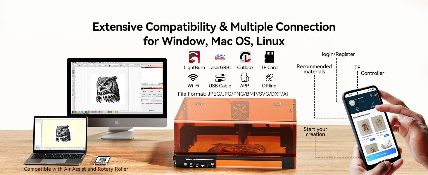 - Works with LightBurn, LaserGRBL, Cutlabx