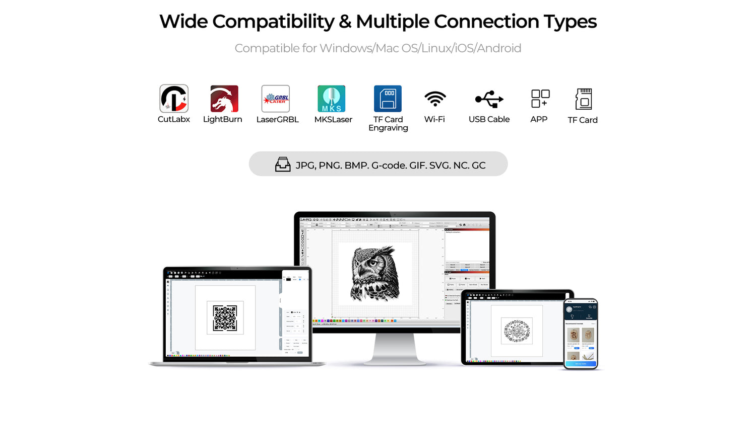 Works on PC/tablet/phone with LaserGRBL, LightBurn, Cutlabx -